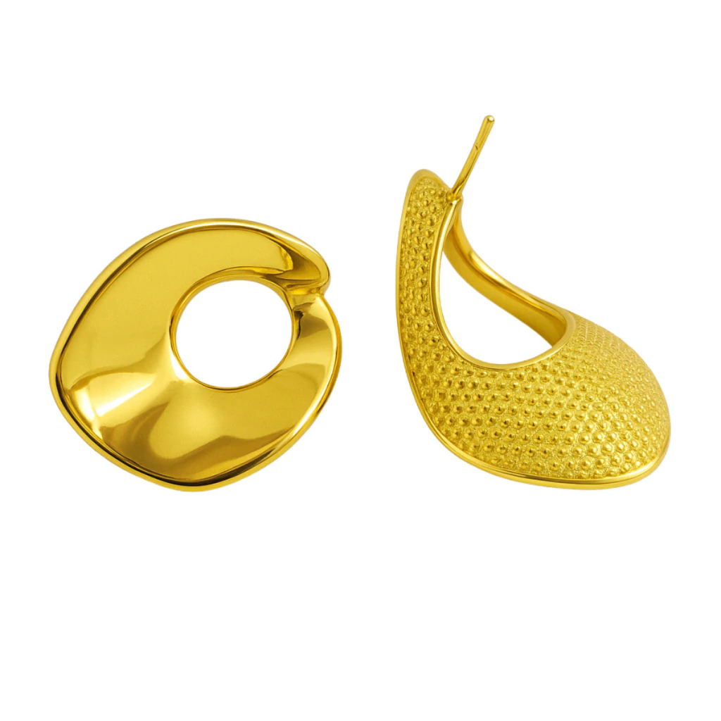 Com formas orgânicas e assimétricas, este brinco apresenta um design artístico e contemporâneo. O recorte vazado central confere leveza à peça, enquanto o acabamento dourado acetinado proporciona um brilho sutil e sofisticado. Ideal para quem aprecia joias com identidade e fluidez, é a escolha perfeita para compor looks criativos e modernos com um toque de elegância natural.
